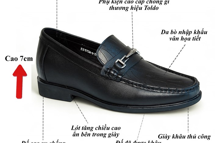 Giày tăng chiều cao 7cm, làm từ da bò cao cấp, mặt trên dập họa tiết tinh tế, tạo điểm nhấn sang trọng. Thiết kế chắc chắn, bền đẹp theo thời gian. Phù hợp đi làm, đi chơi, dạo phố hay dự các dịp quan trọng, tôn dáng mạnh mẽ và lịch lãm.